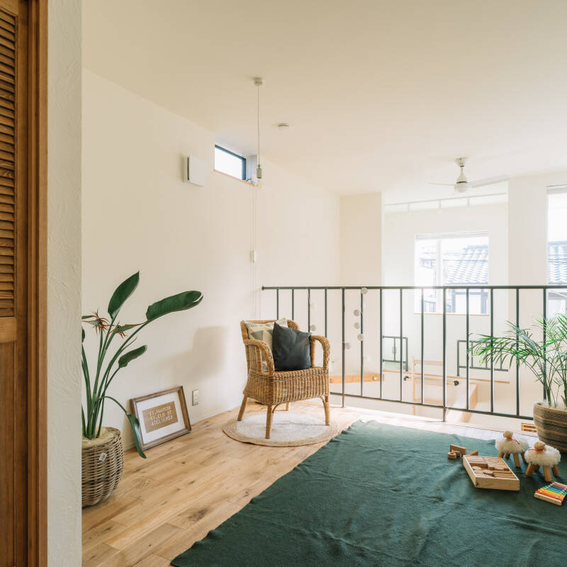 整えすぎない心地よさを編む家〈乙訓郡大山崎町/2階建〉 自然素材の手ざわりや光の抜けを生かしながら、住まいの“ちょうどよさ”を丁寧に整えた住まい。開放的なリビングや植物を迎える出窓、やさしく灯る照明が、飾りすぎない暮らしをつくります。
