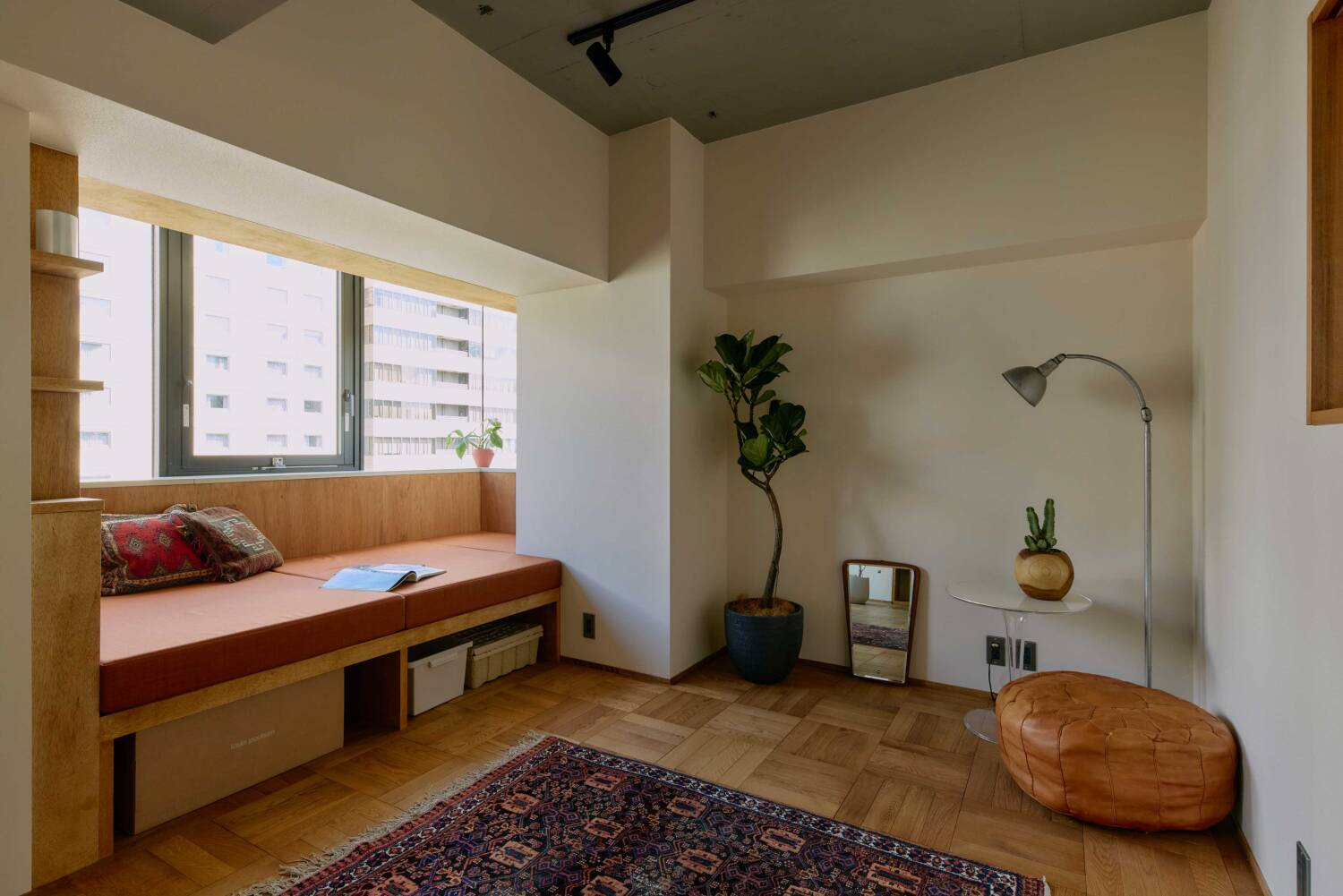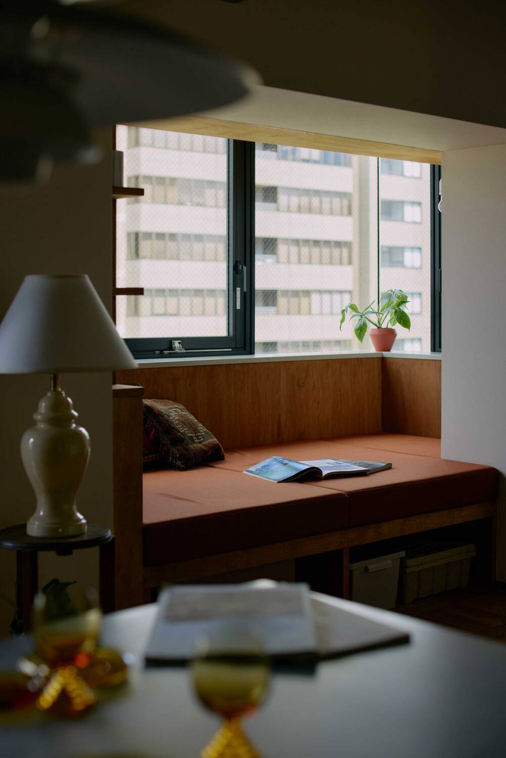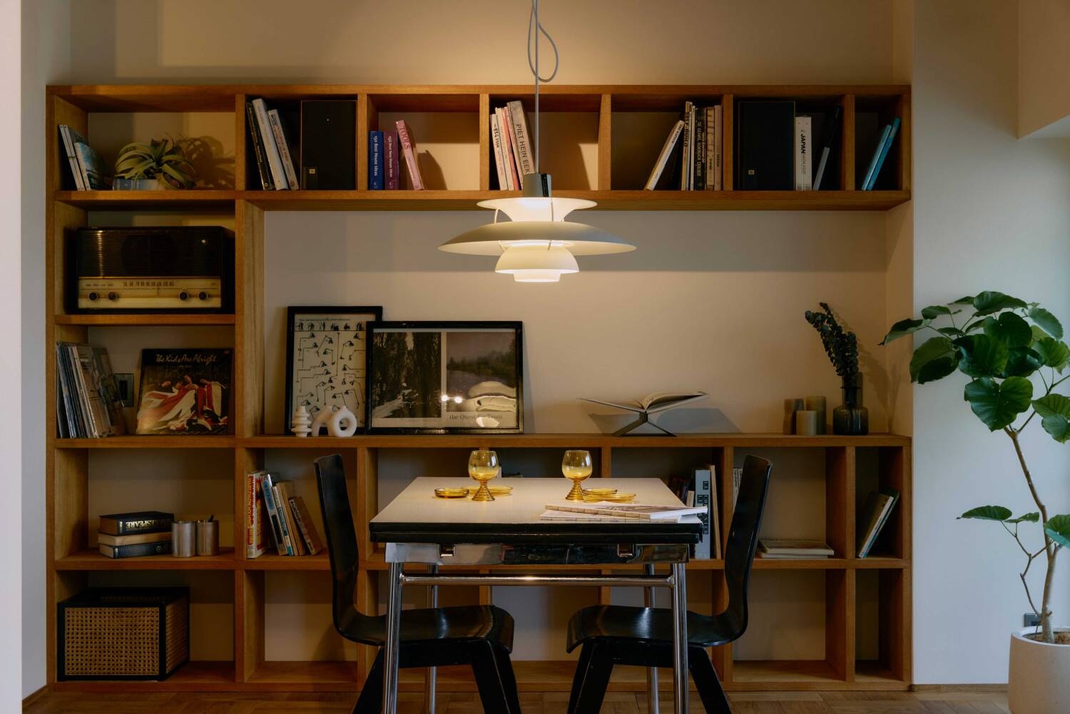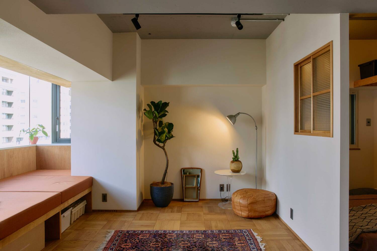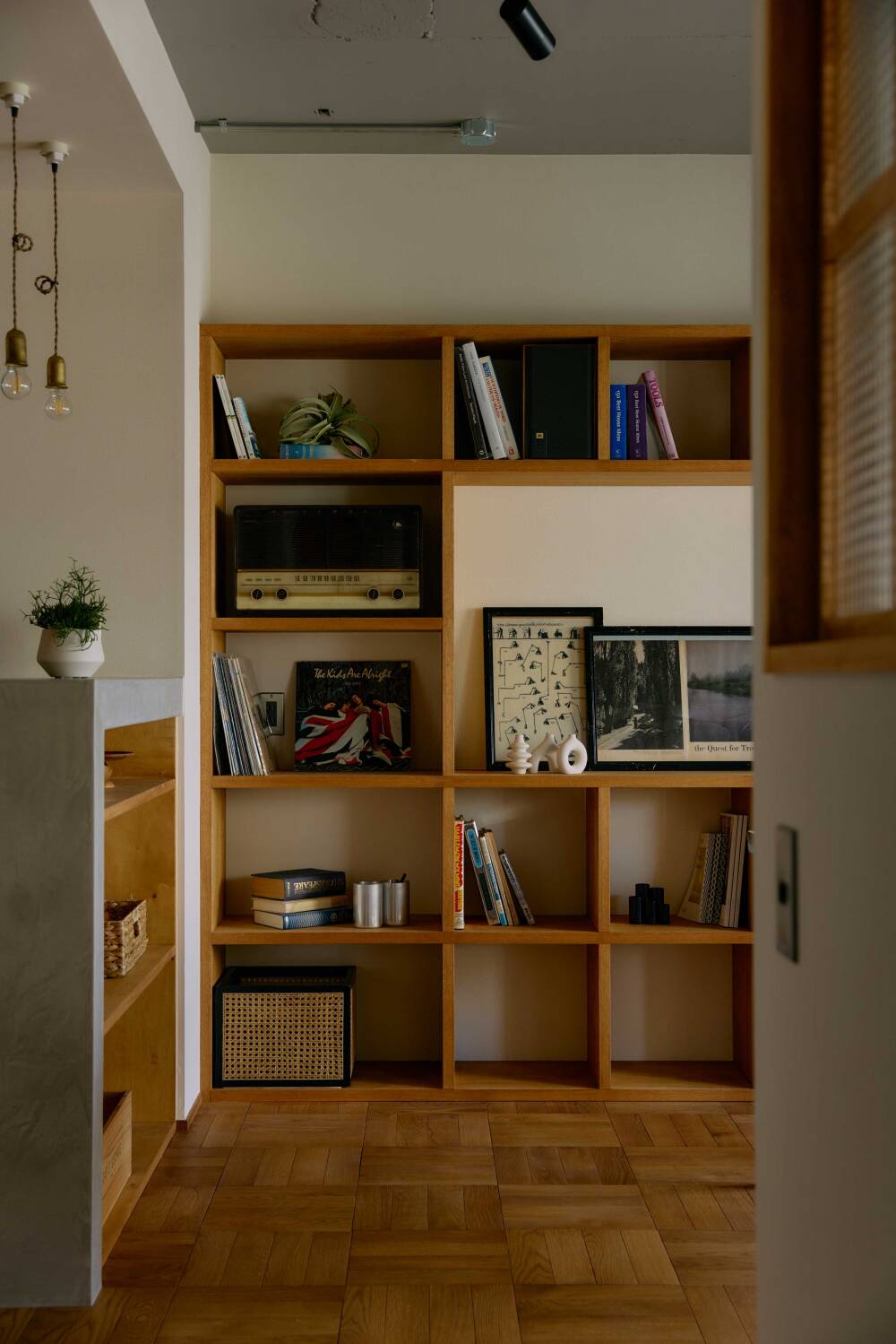 東京から京都へ移り住む節目に合わせ、長く所有してきた築33年のマンションを静かに整え直しました。パーケットフロアのあたたかさやラワンの素朴な表情をいかしつつ、ふたりのこれからの暮らしがすっと馴染むよう、小さな居場所を丁寧に編み込んでいます。レコードや本が並ぶ棚、窓際で息をつけるヌックなど、手を加える量より“心地よく過ごせる余白”を大切にした住まいです。